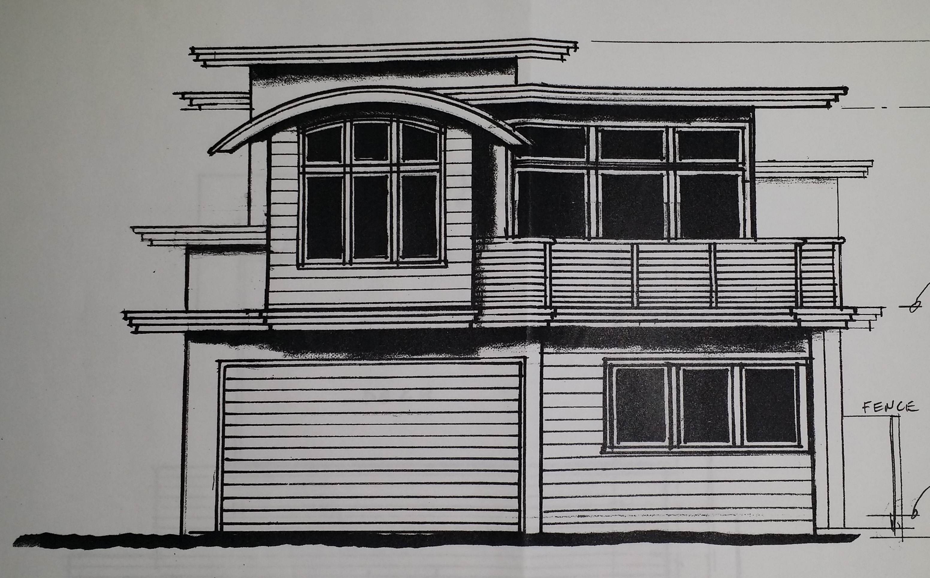 I had a favorite house on the block, friends of my mother had lived there and I had always admired it. Terry had also been their friend and been in the house. Even though that house was on a lot twice the size of ours, it helped to have some places to start. The drawing on the left is from the first plans, which included detailed drawings of the first and second floors as well as the elevation. I liked the design, but Harry felt it was too traditional looking on the outside and in particular he did not like the gabled, dormer window in what was the dining room. He wanted a more contemporary or modern look. We were even willing to look at a flat roof.