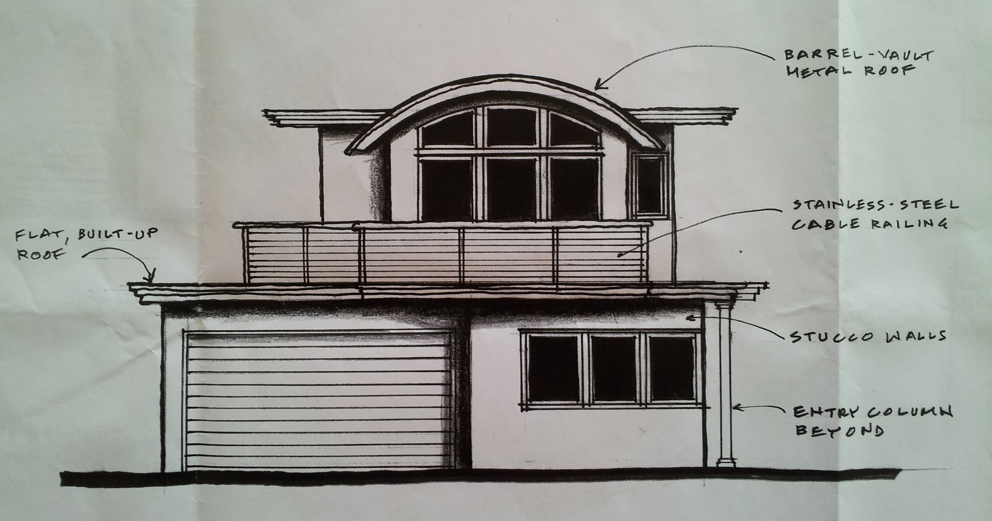 In February of 2012 Terry sent us a new design, more contemporary with a barrel-vaulted roof, cable guard rails at the decks and stucco siding. He said this architectural treatment would take a lot more work but it would give us a nice aesthetic direction for the project. And it has. We felt we were moving in the right direction.